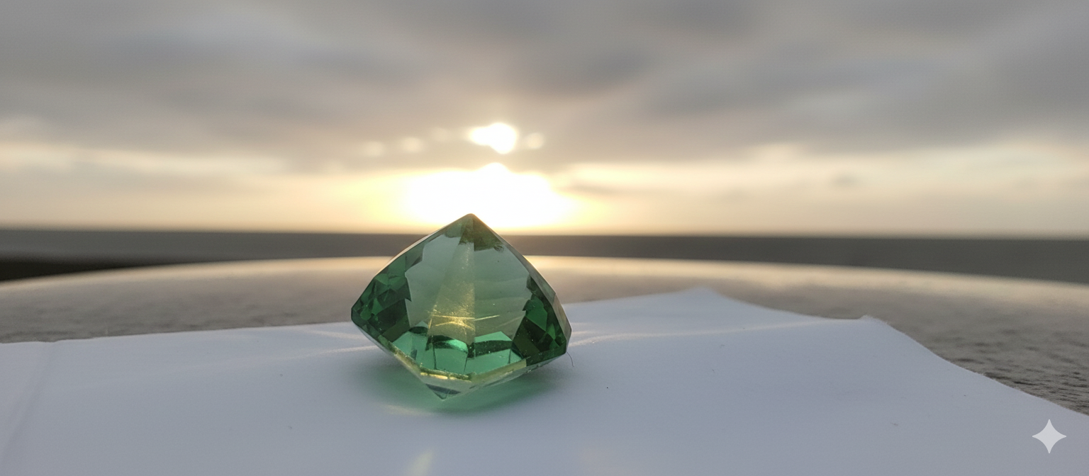 Au sommet de la pyramide de l'Éveil, repose une Spodumène (Hiddenite) d’une rareté absolue de 18.84 carats. Sa taille architecturale révèle quatre faces d'un vert profond, une nuance que j'appelle le "Vert Sahel" : une couleur qui ne se laisse pas nommer, oscillant entre l'espérance des premières pluies et la sagesse des forêts anciennes de l'Afrique.